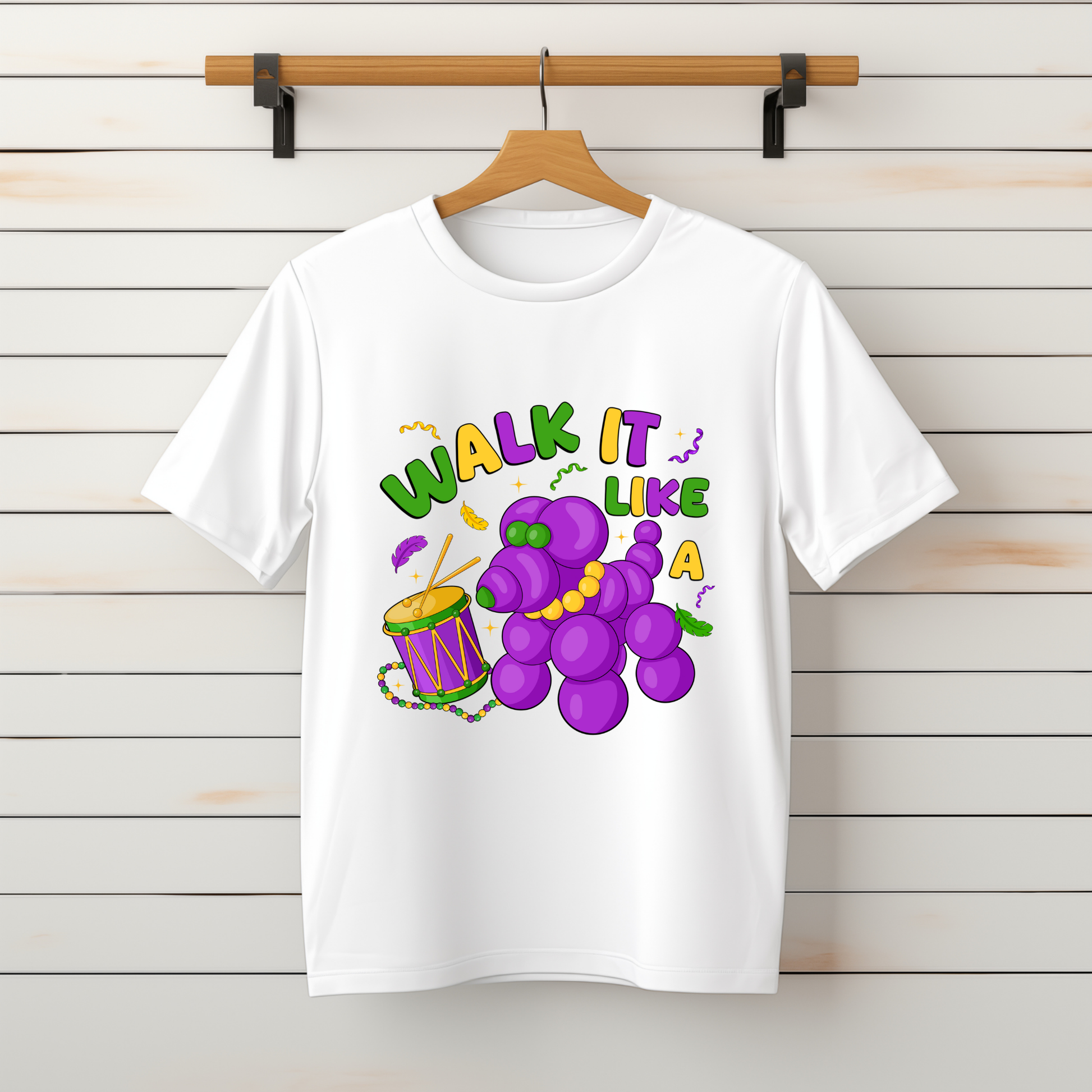 This fun and festive Mardi Gras tee features a bright purple balloon dog marching to the beat of its own drum—literally! Surrounded by beads, confetti, and carnival colors, this playful design is perfect for parade routes, school parties, and anyone who loves a cute twist on Mardi Gras tradition. Light, comfy, and guaranteed to make people smile!