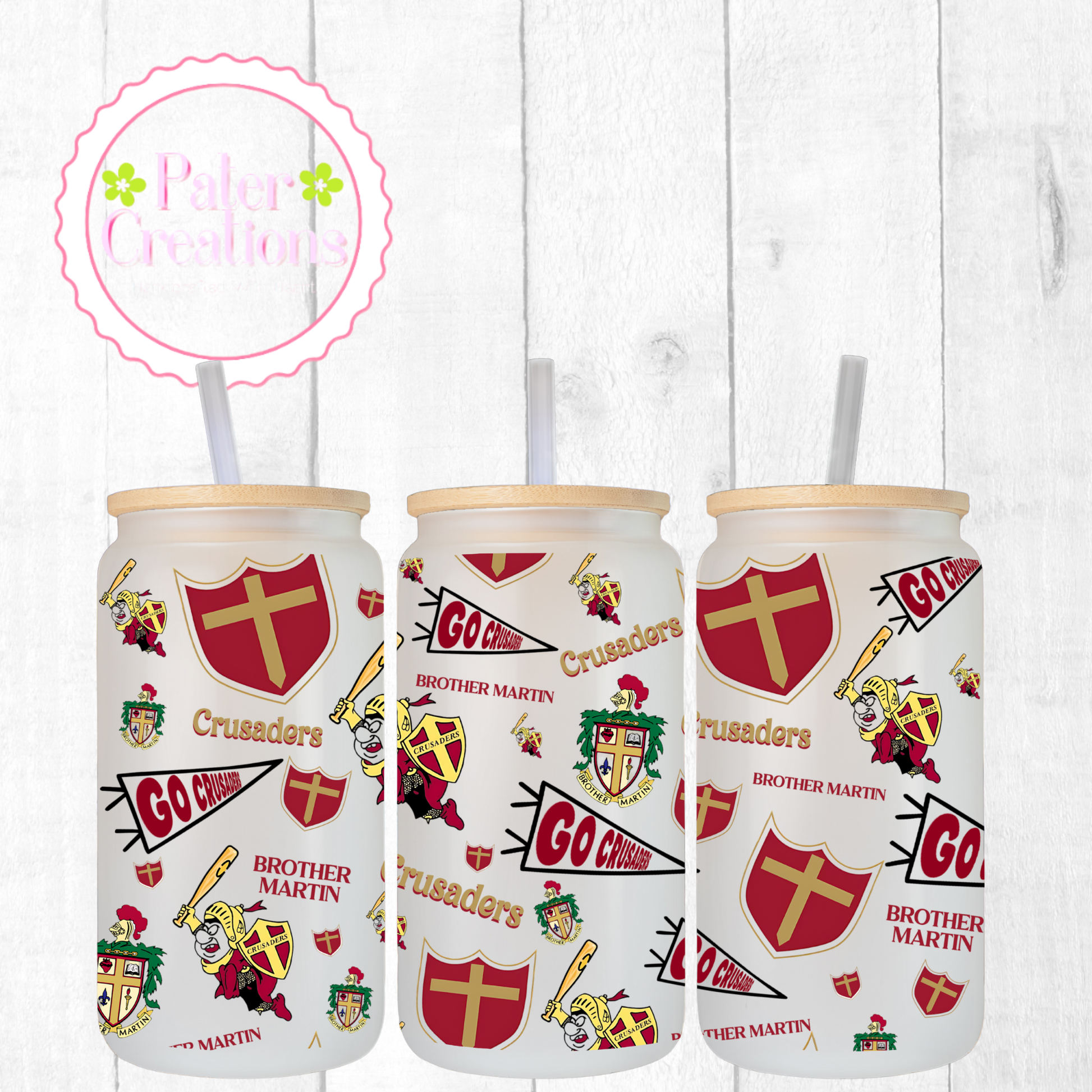Made with quality Libbey glass and custom-wrapped in vibrant green and gold vinyl, this cup features the iconic Brother Martin Crusaders crest — perfect for game days, tailgates, or everyday school spirit.