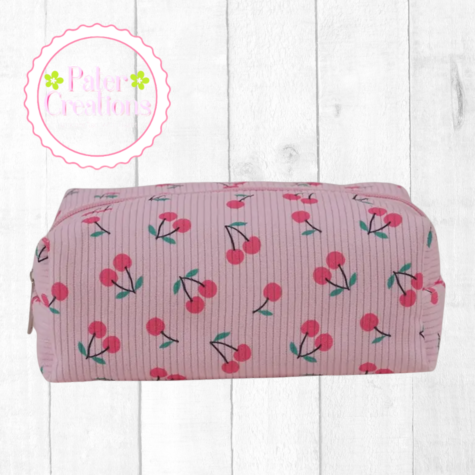 a playful pop of color to your everyday must-haves. Designed with a soft pink ribbed fabric and covered in juicy cherry prints, this cosmetic bag is as functional as it is adorable.